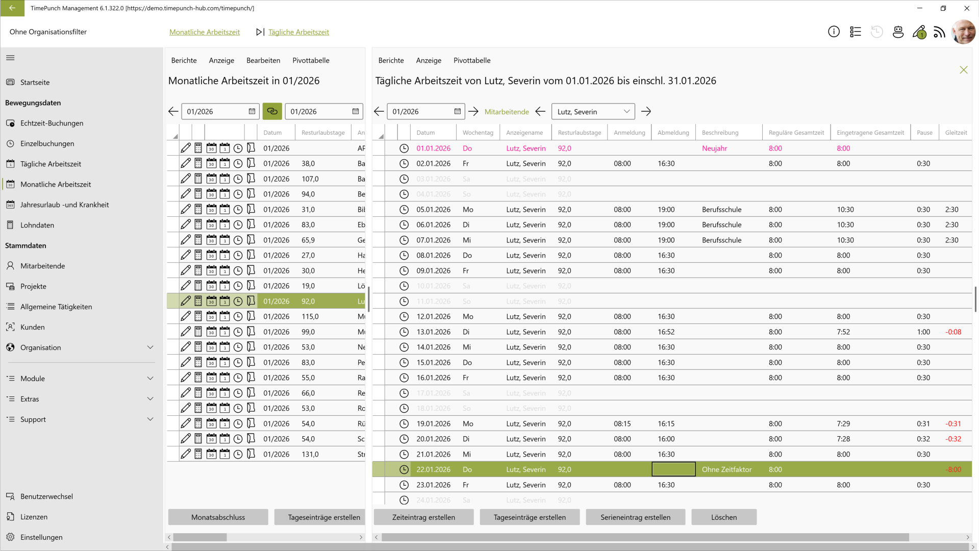 Beim Zeitfaktor 0 werden keine Start- und Endezeiten des Eintrags in der Übersicht angezeigt, obwohl es sich um einen Arbeitszeiteintrag handelt.