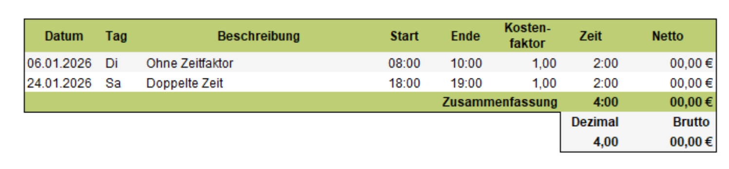 Eine Stunden Arbeitszeit mit dem Worktime-Factor 2 und dem Cost-Factor 1, darf bei der Rechnungstellung nur der Cost-Factor berücksichtigt werden.