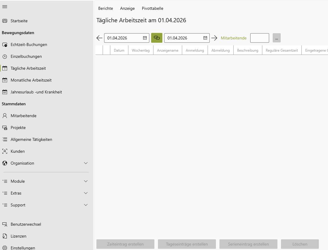 Workaround: Über die Seite Einzelbuchungen, kann ein neuer Zeiteintrag angelegt werden